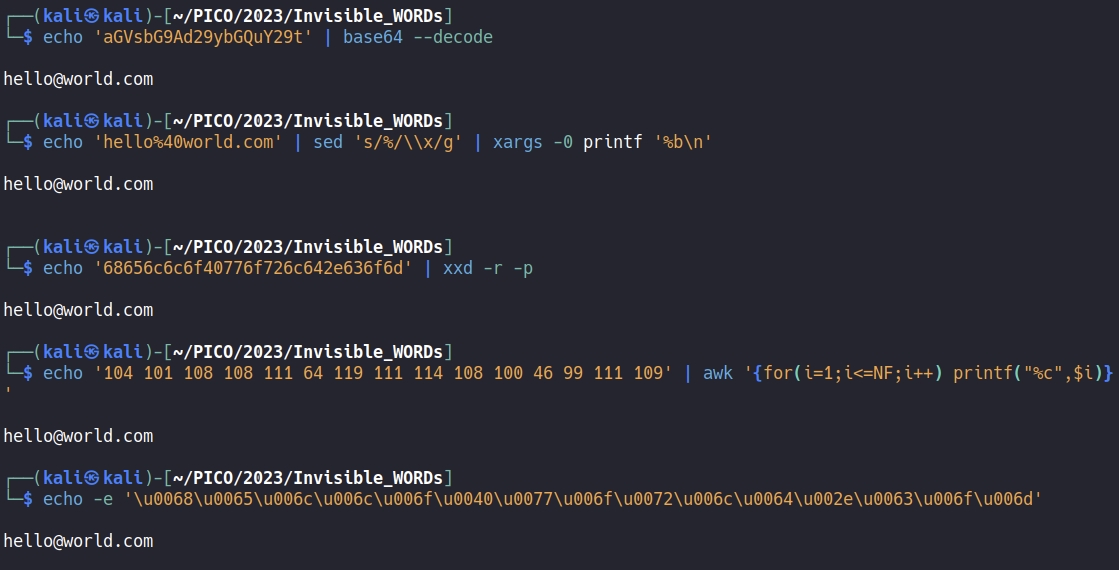ASCII Encoding: "104 101 108 108 111 64 119 111 114 108 100 46 99 111 109"